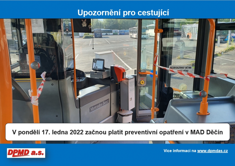 S ohledem na mutaci omikron a očekávanou vlnu šíření nemoci covid-19 zavádí MAD Děčín preventivní opatření na autobusových spojích.