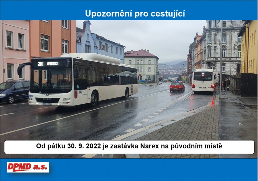 V pátek 30. 9. 2022 v průběhu dne dojde k obnovení obousměrného provozu na Novém mostě. A proto se zastávka Narex směr Nemocnice vrátí na původní stanoviště. Díky této dopravní situaci, kdy Nový most bude opět provozován plnohodnotně v obou směrech, by nemělo docházet zejména v odpoledních hodinách ke zpoždění linek MAD Děčín. Na každém staničním jízdní řádu je v pravém horním rohu QR odkaz na odjezdové tablo dané zastávky, který nabízí aktuální odjezdy autobusů.