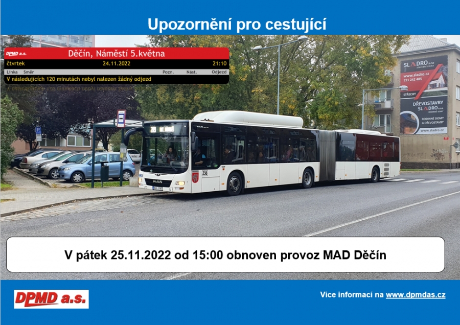 S ohledem na možnosti nenadálých změn v termínu výluky u vybraných linek doporučujeme sledovat informace na www.dpmd.cz nebo na Facebook DPMD,a.s.